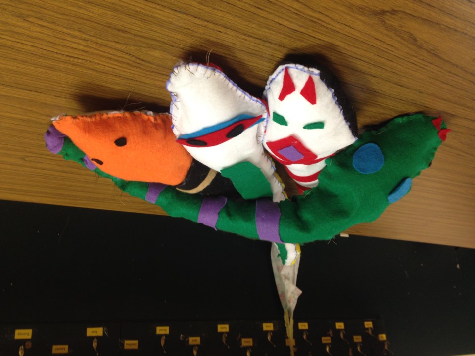 Some of the completed draft snakes. Hot-glued felt details and hand- sewn edges. This was a multi-day project at both schools that I felt went really well. All of the children participated and all of them sewed their snakes completely by themselves.