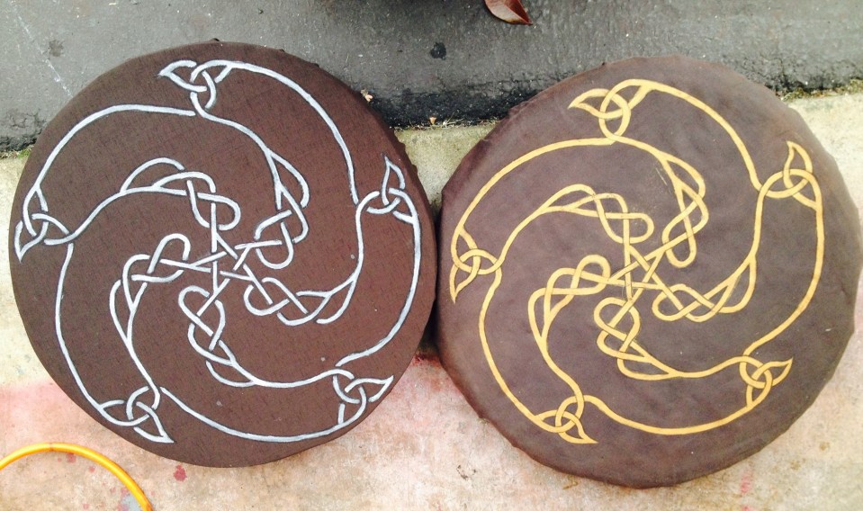 Two painted fabric shields, made 3 years apart,