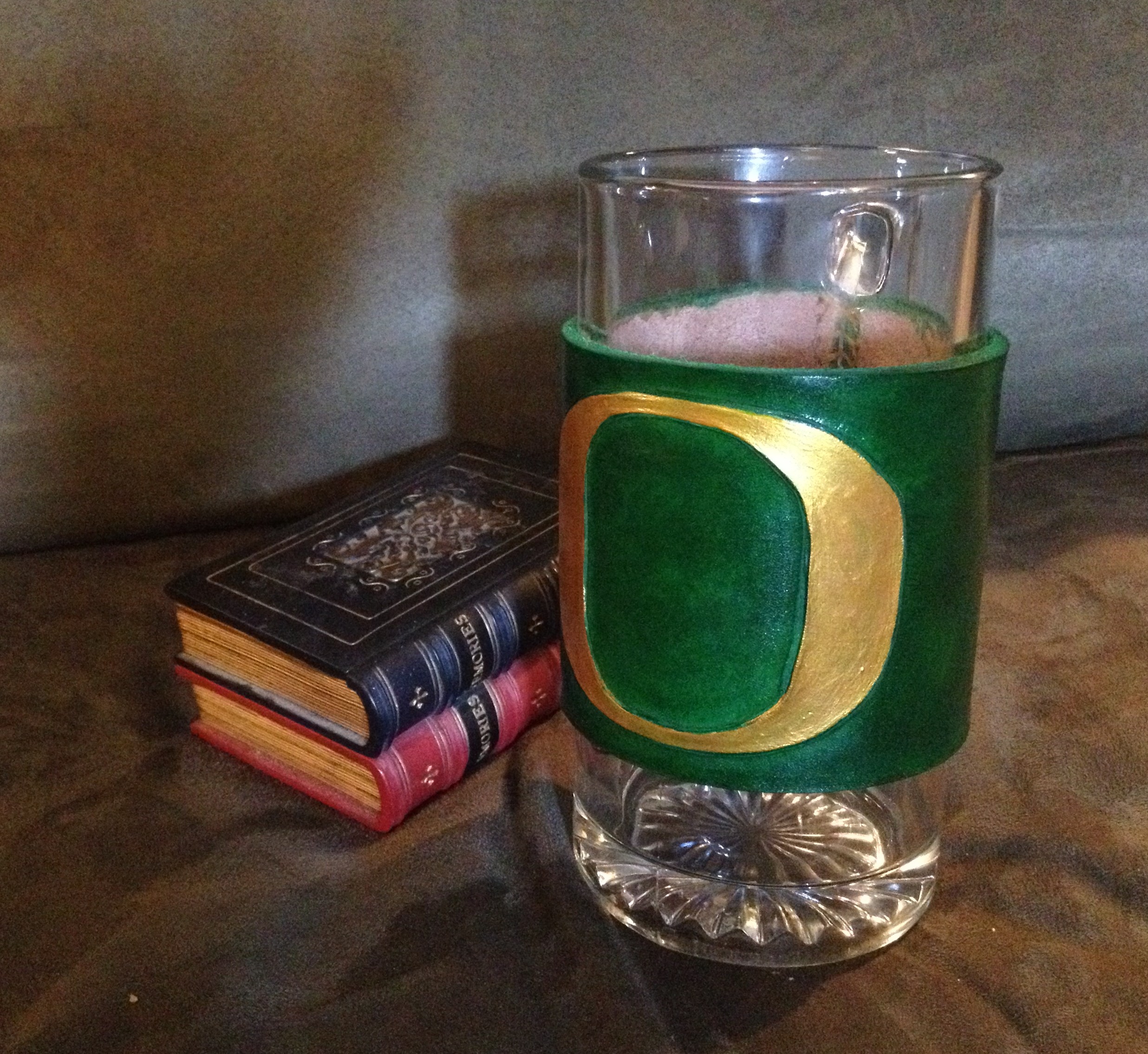 A tooled leather mug for the University of Oregon Belegarth chapter.