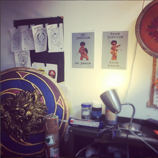 My new space with orders on the wall, a shield ready to ship, and some wal-art for fighter inspiration from IRL SJwarriors.