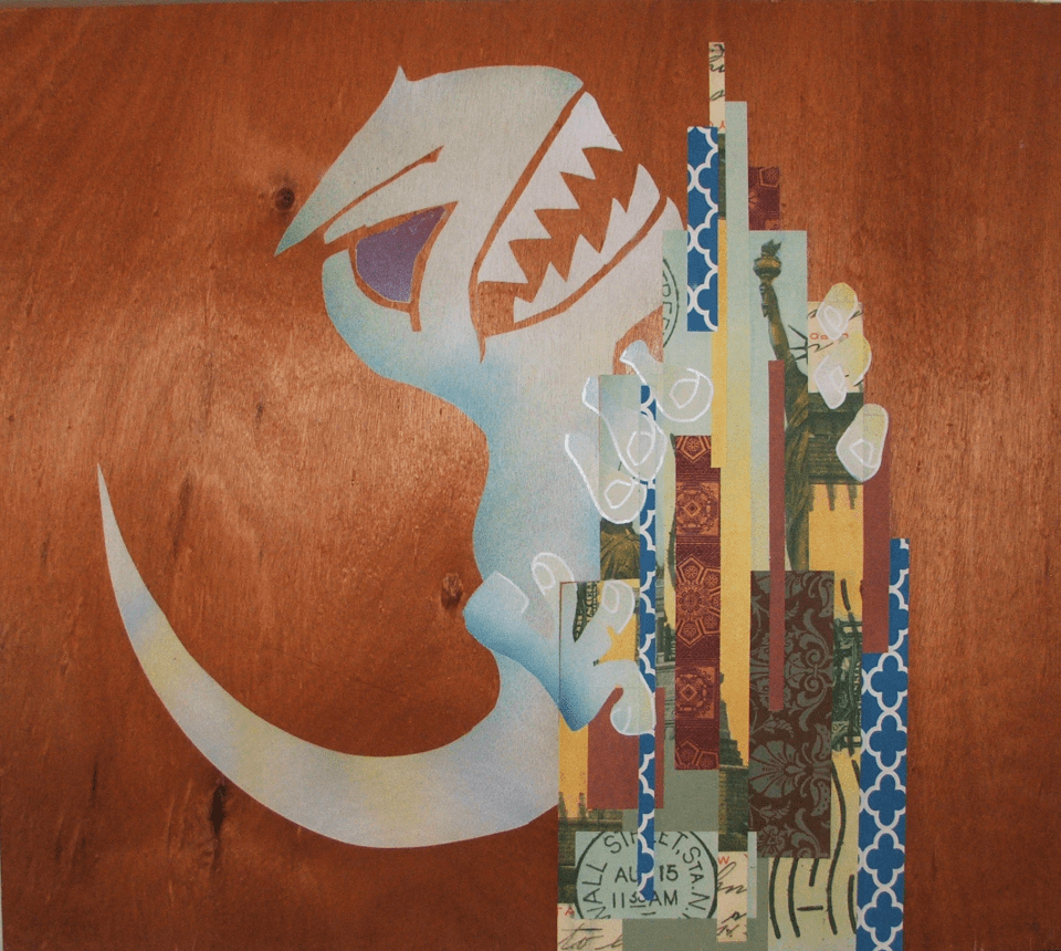 Cute-Zilla, mixed media on wood, 36 x 40 inches